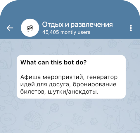 Бот помогает находить лучшие варианты для отдыха, предлагает актуальные события и генерирует креативные идеи для досуга.